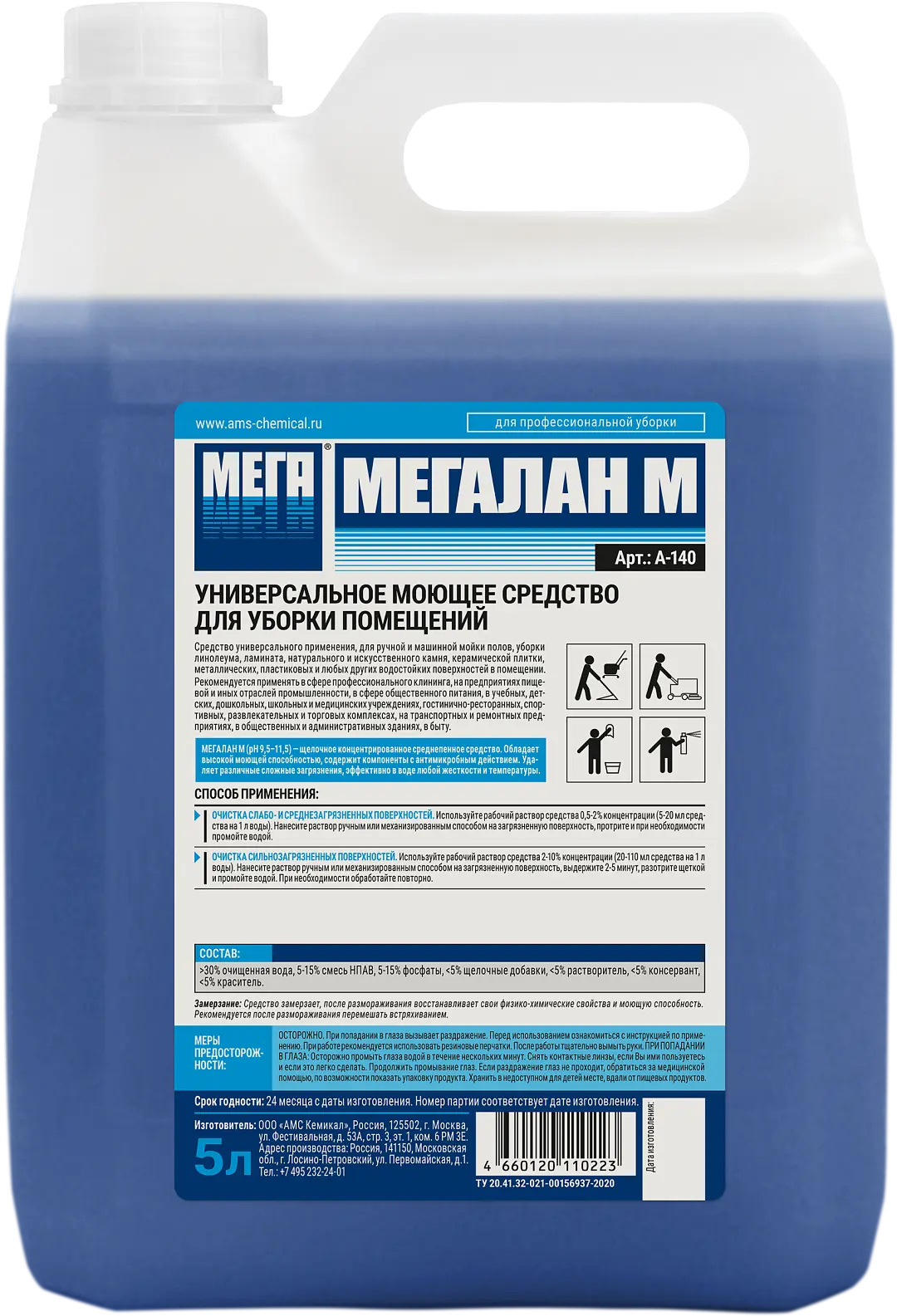 Средство щелочное концентрированное универсального применения, для ручной и машинной мойки полов, уборки линолеума, ламината, натурального и искусственного камня, керамической плитки, металлических, пластиковых и любых других водостойких поверхностей в помещении. Средство обладает высокой моющей способностью, содержит компоненты c антимикробным действием, удаляет различные сложные загрязнения, эффективно в воде любой жесткости и температуры.