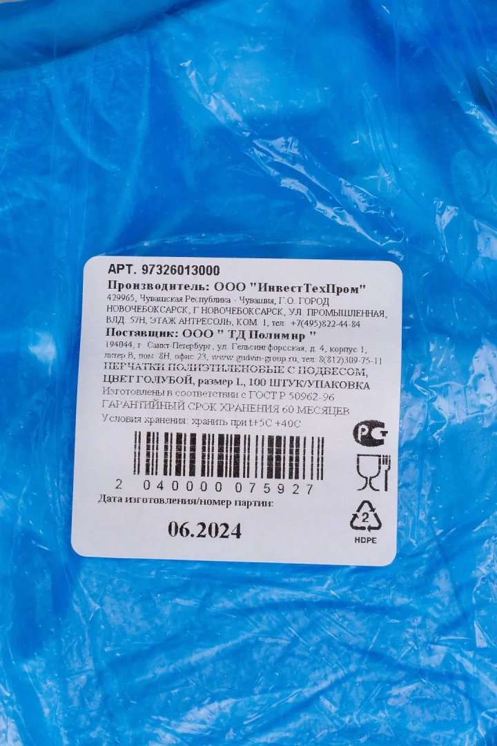 Перчатки: полиэтиленовые L одноразовые синие с подвесом /пач.=100 шт.