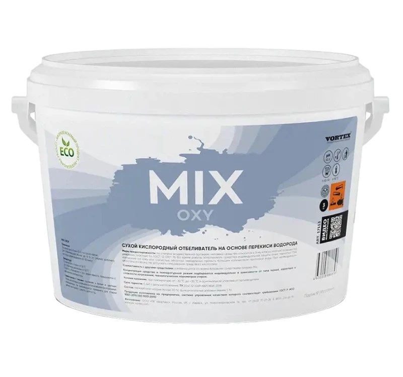 Сухой кислородный отбеливатель на основе перекиси водорода Vortex CleanBox Mix OXY 3 кг. Обладает мощным отбеливающим действием при невысоких температурах (40 °C) и низких дозировках. Не вызывает изменения оттенков у цветных изделий, устойчивых к кислородному отбеливанию. Эффективного справляется с пятнами вина, соков, фруктов, чая, кофе, травы и другими пятнами животной и растительной природы. В процессе использования разлагается на безопасные компоненты, поэтому не требует дополнительной нейтрализации. Отбеливатель может использоваться как в комбинации с моющими средствами Vortex GoodMix, так и в качестве основного средства для отбеливания.Средство обладает низкой вязкостью и применимо для любых стиральных машин и дозирующих систем