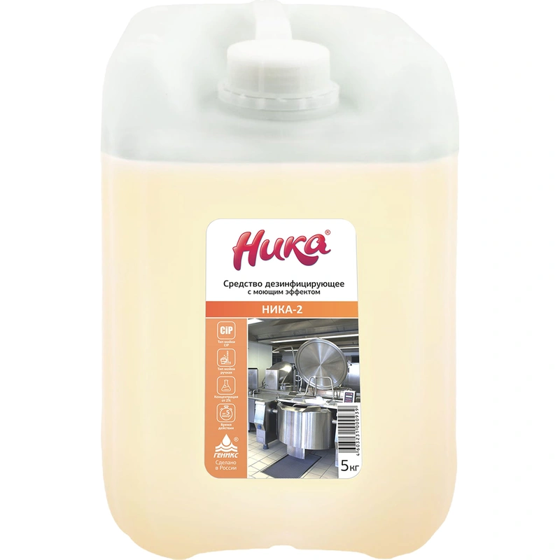 /шт.Средство "Ника-2" обладает моющими и дезинфицирующими свойствами в отношении бактерий группы кишечных палочек (колиформных), стафилококка золотистого, дрожжей и плесеней. Предназначено для обеззараживания поверхностей технологического оборудования, аппаратуры, инвентаря, тары, бытовых и производственных помещений.